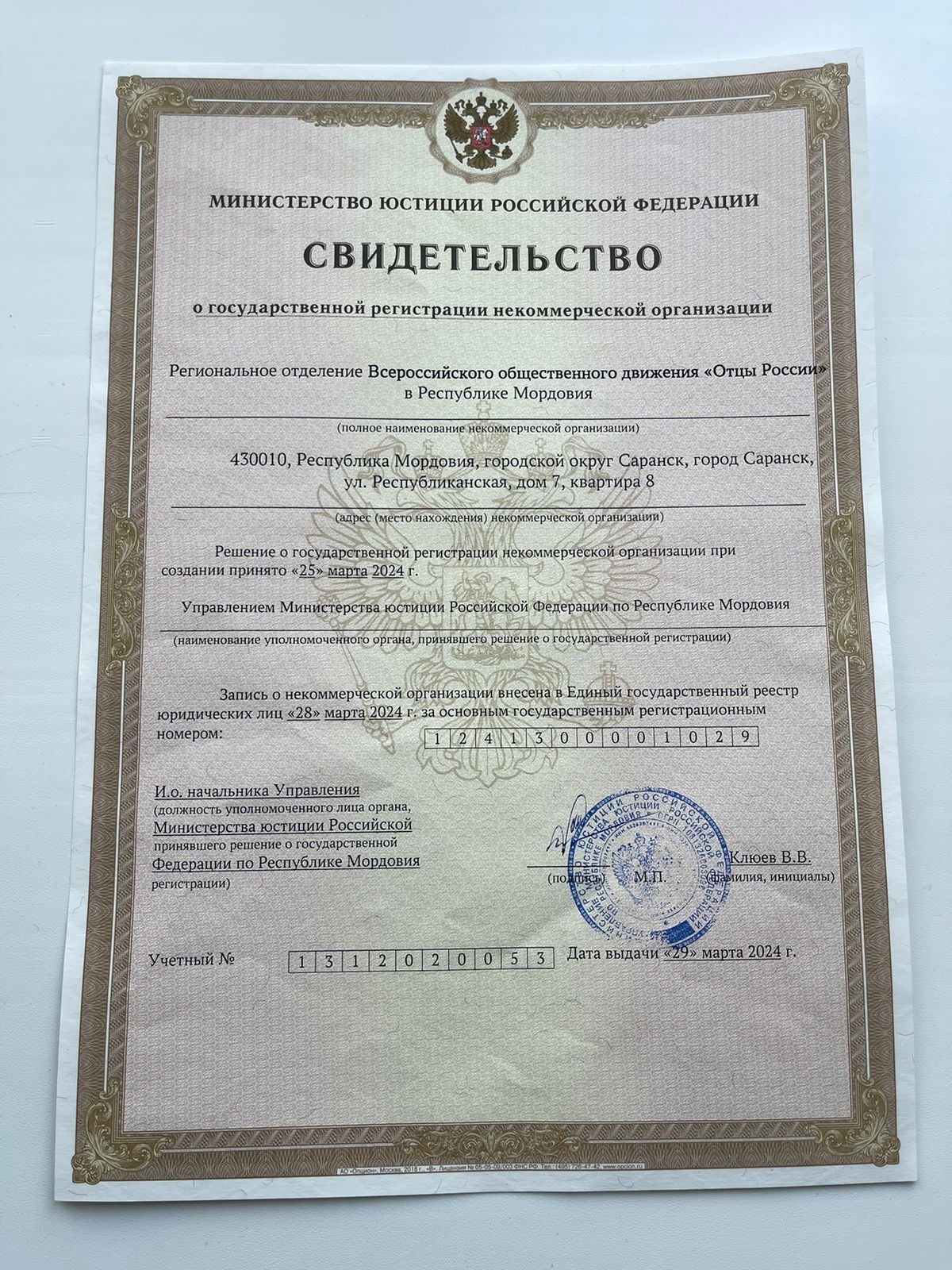 Отделение в республике Мордовии официально зарегистрировано Вчера отделение Всероссийского общественного движения «Отцы России» получило документы из Министерства юстиции об официальной регистрации.