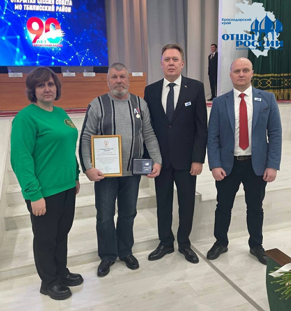 Медаль «Отец солдата» вручили отцу из Тбилисского района Краснодарского края Сегодня на открытой сессии совета МО Тбилисского района представители регионального отделения ВОД «Отцы России» в Краснодарском крае совместно с координатором штаба Комитета Семей Войнов Отечества в регионе Надеждой Бойко вручили очередную награду общественного признания «Отец солдата».