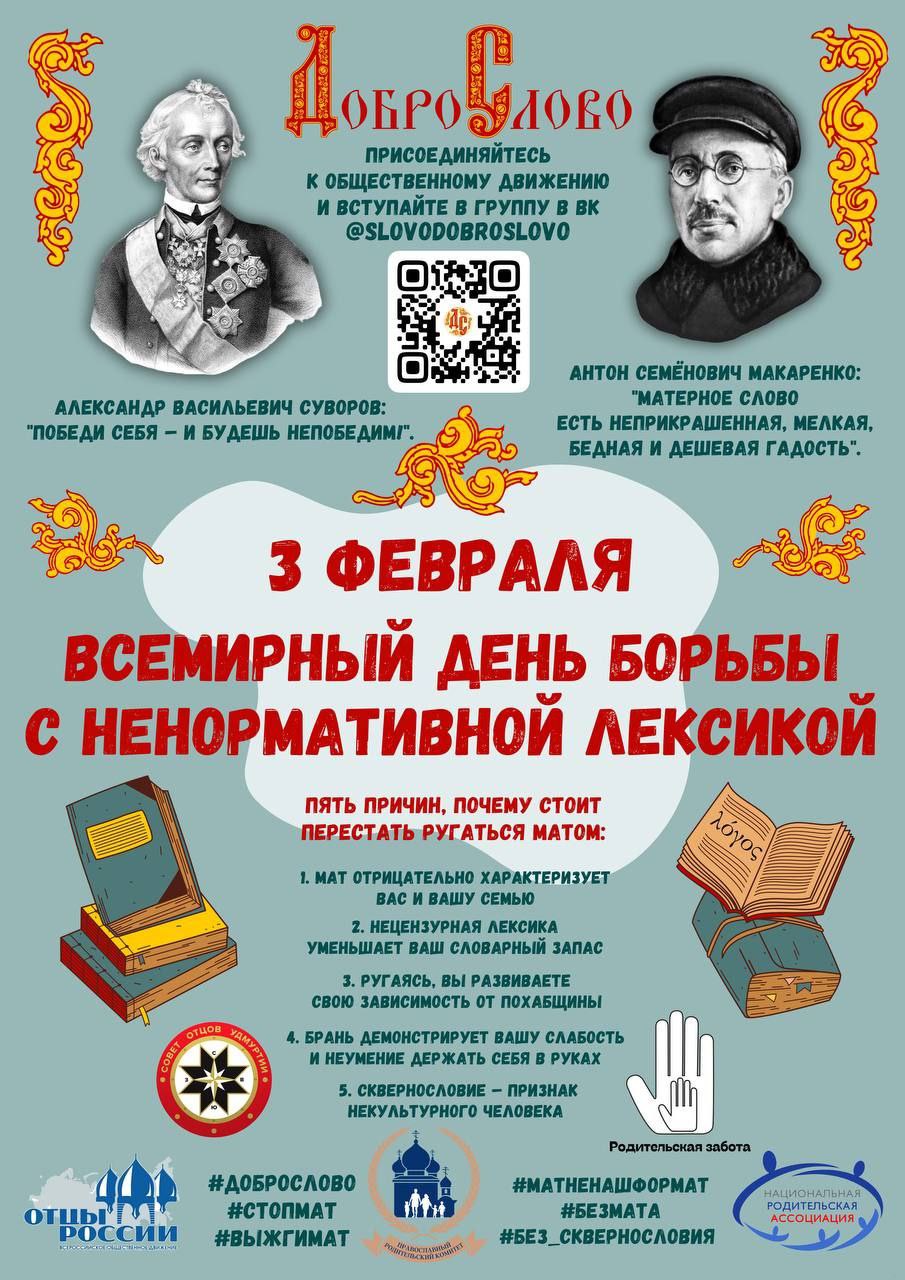 «Отцы России против» сквернословия! Ежегодно в начале февраля мы поддерживаем наших отцов из Удмуртии и их проект «Доброслово». Традиционно приглашаем всех отцов принять участие в Неделе доброго слова по всей стране.