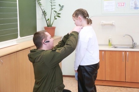 По инициативе Совета отцов детям героев спецоперации вручают знак «Мой папа герой». Теперь такой значок с гордостью будут носить и ученицы школы №93 Алина с Самирой.