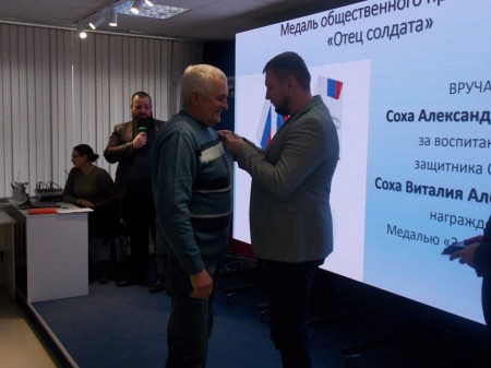 Сегодня три отца получили медали «Отец солдата» из рук председателя Народного Совета ЛНР Дениса Мирошниченко. Ещё шесть наград в ближайшее время будут вручены отцам прямо на боевых постах.