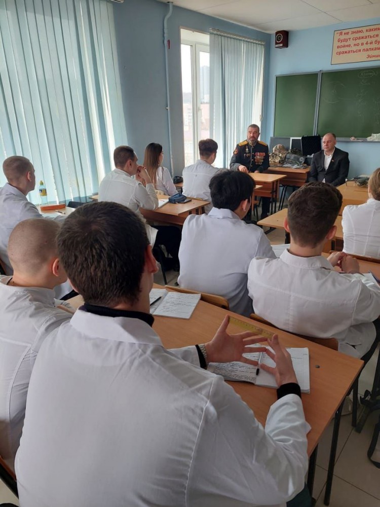 В Тихоокеанском государственном медицинском университете Владивостока состоялась встреча в рамках патриотического проекта «Равнение на защитников Отечества». Председатель отделения Всероссийского общественного движения «Отцы России» в Приморском крае, участник СВО Виктор Тарабарин и ветераны специальной военной операции — гвардии подполковник 155-й бригады морской пехоты Константин Телятьев, представитель ВПК «Де-Фриз» Вячеслав Бедных — пообщались с будущими медиками, студентами 2 курса.