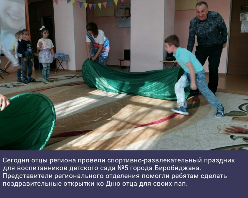 Сегодня отцы региона провели спортивно-развлекательный праздник для воспитанников детского сада №5 города Беробиджана. Представители регионального отделения помогли ребятам сделать поздравительные открытки ко Дню отца для своих пап.
