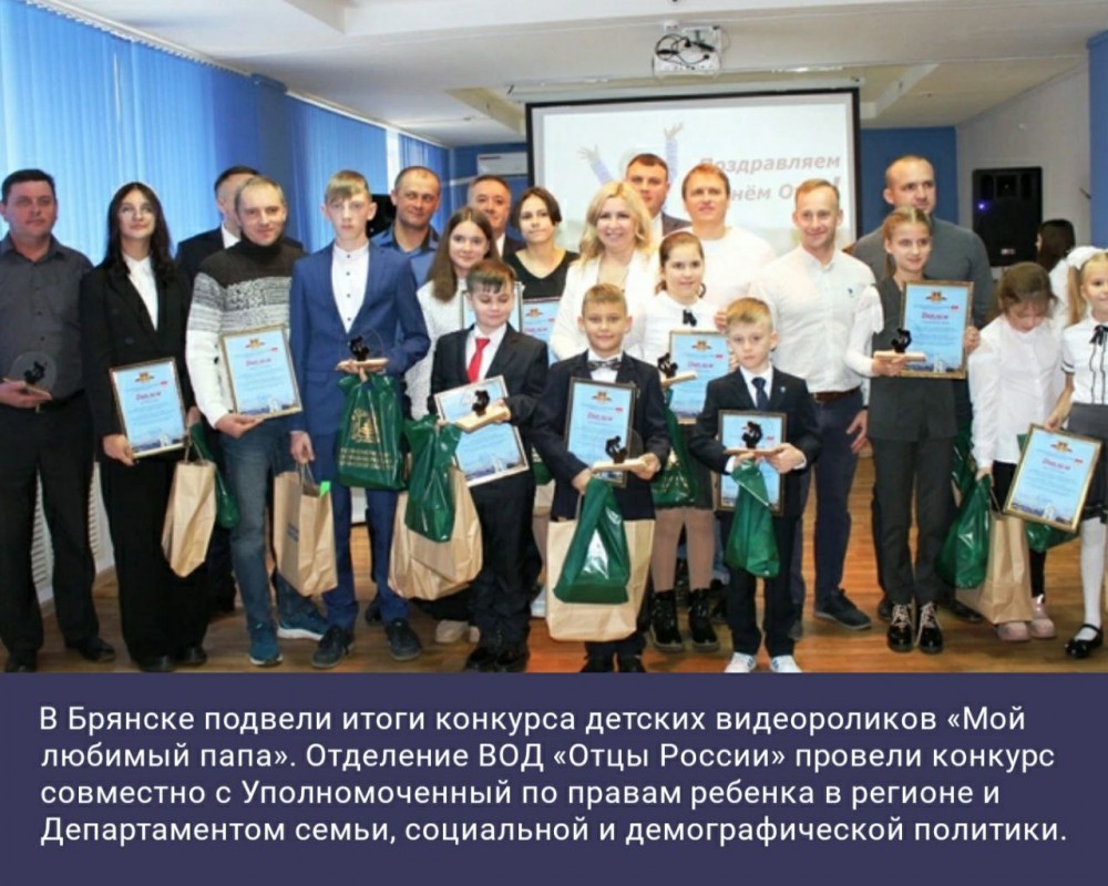 В Брянске подвели итоги конкурса детских видеороликов «Мой любимый папа». Отделение ВОД «Отцы России» провели конкурс совместно с Уполномоченный по правам ребенка в регионе и Департаментом семьи, социальной и демографической политики.