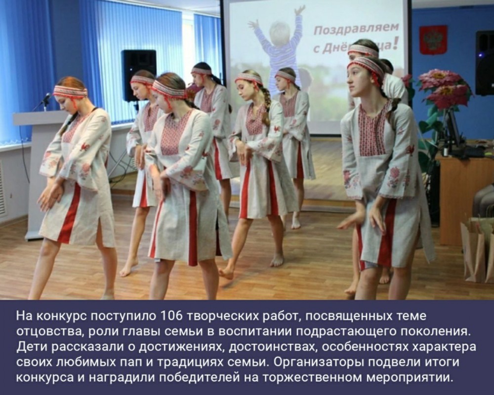 На конкурс поступило 106 творческих работ, посвященных теме отцовства, роли главы семьи и воспитании подрастающего поколения. Дети рассказали о достижениях, достоинствах, особенностях характера своих любимых пап и традициях семьи. Организаторы подвели итоги конкурса и наградили победителей на торжественном мероприятии.