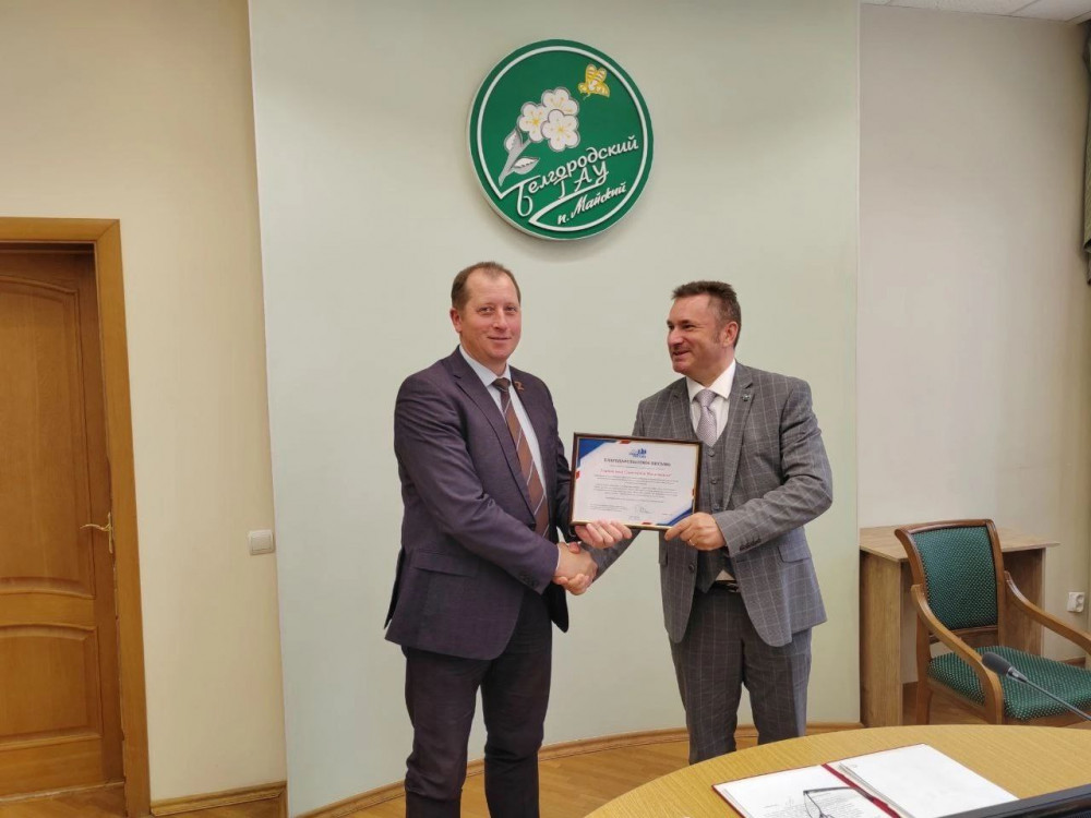 На днях состоялось заседание ректората Белгородского государственного аграрного университета, на котором председатель отделения ВОД «Отцы России» в регионе Александр Косов вручил благодарственное письмо от Председателя Правления движения Андрея Юрьевича Коченова ректору университета Станиславу Николаевичу Алейнику.