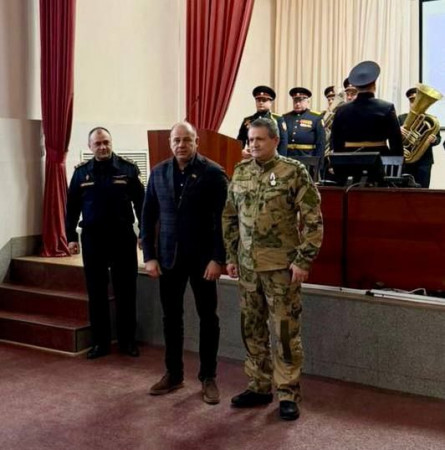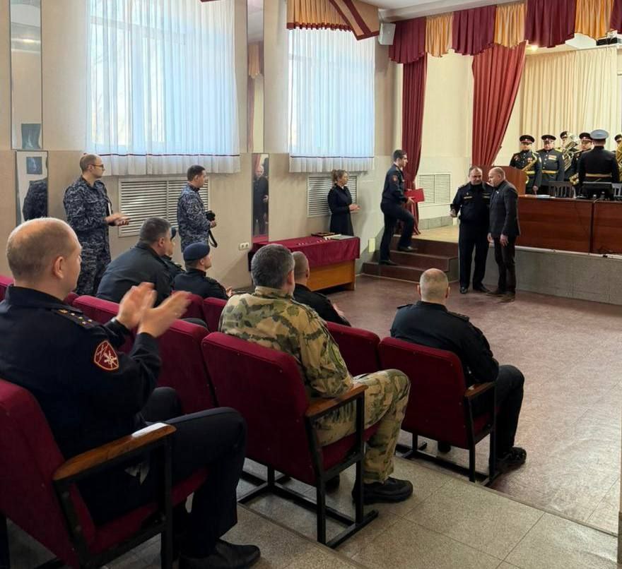 Депутат Думы города Владивостока, председатель регионального отделения Всероссийского общественного движения «Отцы России» в Приморье Виктор Тарабарин вручил медаль общественного признания полковнику Росгвардии, командиру отряда ОМОН «Восход» Эдуарду Дядюре.