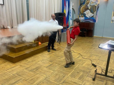 Кураторы провели интересное занятие с учениками школы № 35. Отцы привезли реквизит и ребята научились пользоваться разными видами огнетушителей, примерили форму пожарного спасателя, ответили о правилах поведения при пожаре и общей безопасности дома и на улице.