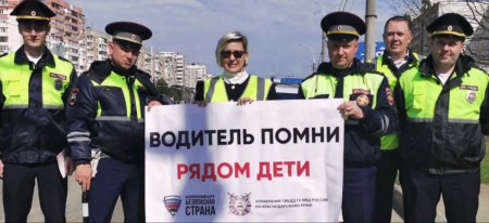 Представители ВОД «Отцы России» по Краснодарскому краю с автоинспекторами и общественным движением «Безопасная Страна» привлекли внимание участников движения с помощью яркого плаката «Водитель, помни – ребёнок рядом!».